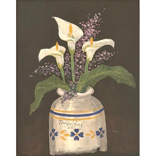 ΛΟΥΛΟΥΔΙΑ ΣΤΟ ΒΑΖΟ ΕΛΑΙΟΓΡΑΦΙΑ ΣΕ ΚΑΜΒΑ 70χ80 ΕΚ. ΥΠΟΓΕΓΡΑΜΜΕΝΟ ΚΑΙ ΧΡΟΝΟΛΟΓΗΜΕΝΟ (1964-1967) ΣΤΟ ΚΑΤΩ ΜΕΡΟΣ